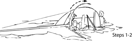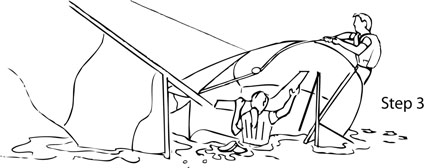 Most often, when a boat tips over it capsizes to leeward because the force of the wind overcomes the ability of the crew to hike or let out the sails. It is important to practice capsize recovery drills before you need to use them on your own. Once the boat is on its side and the sails are in the water, you should act promptly to right the boat. The Scoop Method of recovery gets its name because one crew is "scooped" into the cockpit as the other rights the capsized boat. (click images to view full-size)