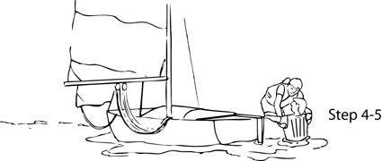 - Helmsman moves to centerboard, climbs onto it, and while holding onto the gunwale leans back to bring the boat upright.